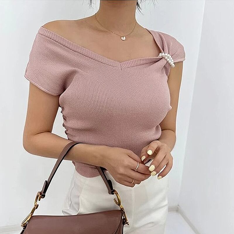 Komiyama Feminino セクシースクエアカラー Y2k トップス夏パールバックル Tシャツニット Tシャツ半袖 Ropa ショート ハーフスリーブ サマー 夏物 真珠 スクウェア | eight