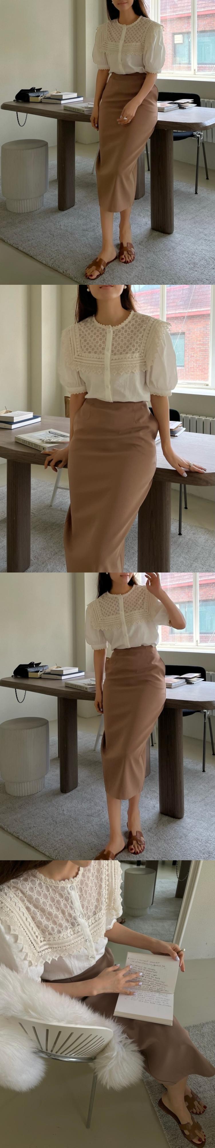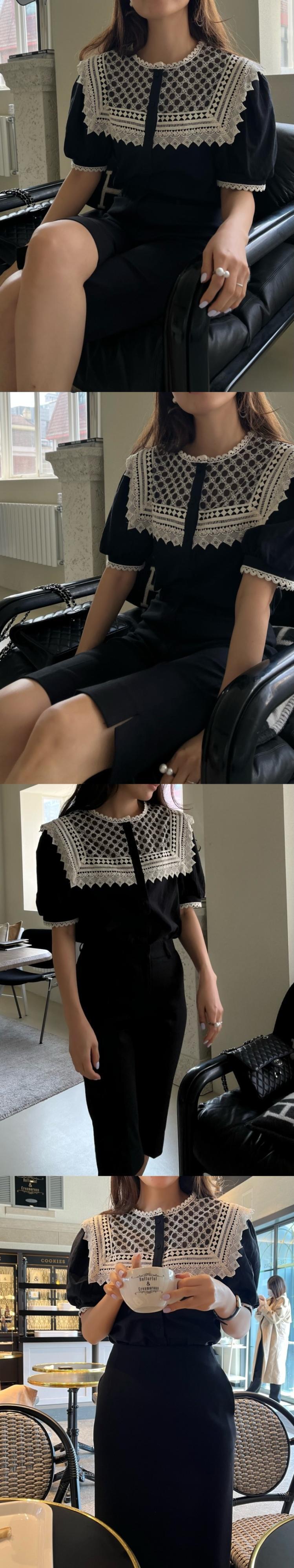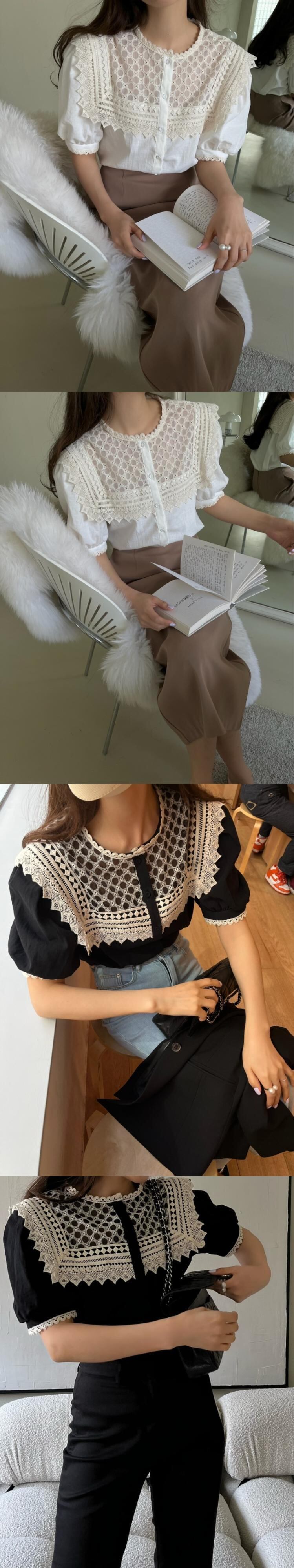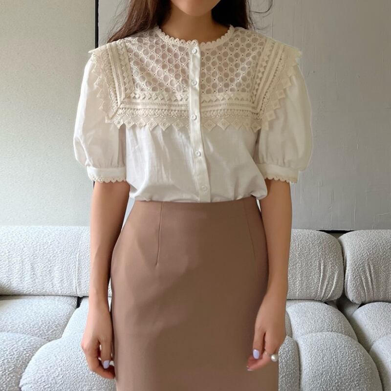 Komiyama 夏 パッチワーク レース O ネック パフスリーブ シャツ ブラウス シャツ トップス スイート ソリッド 大人ガーリー スウィート キュート カジュアル サマー 夏物 Oネック ソリッドカラー | eight