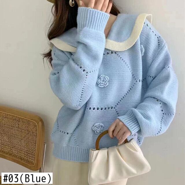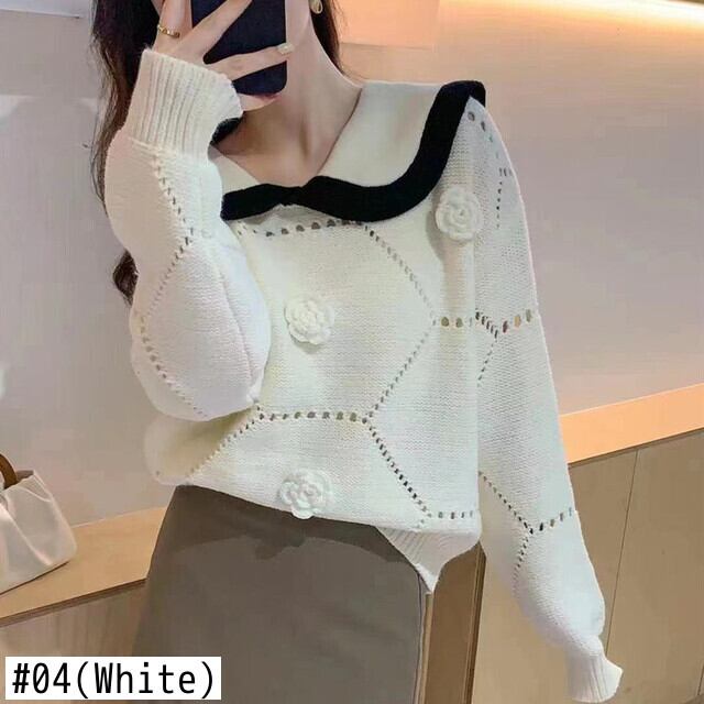 Komiyama ピーターパン襟中空アウトプルオーバー 3d 花ニットセーター甘い Y2k トップス秋冬服 大人ガーリー スウィート キュート カジュアル オータム 秋物 ウィンター 冬物 花柄 | eight