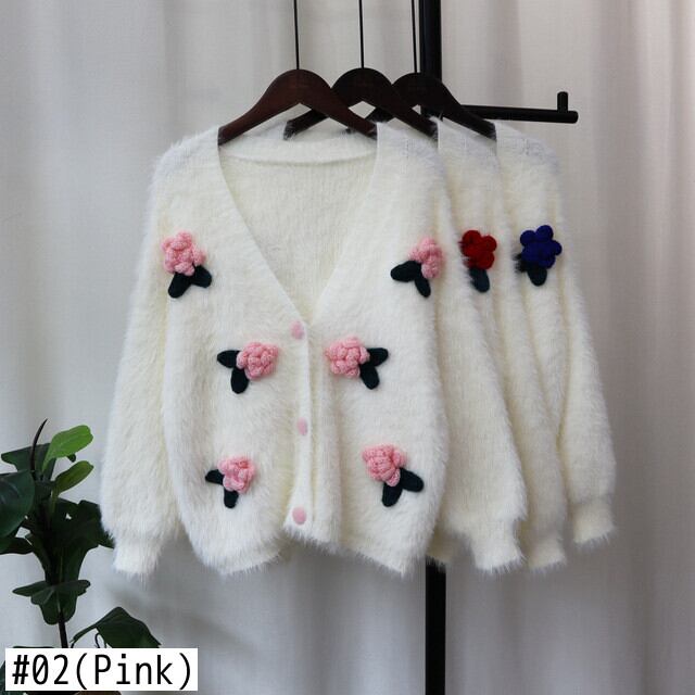Komiyama 防水ミンク 3d フラワーカーディガン長袖セーター秋 V ネックレディース甘いニットトップス ロング 大人ガーリー スウィート キュート カジュアル オータム 秋物 Vネック フラワーデザイン | eight