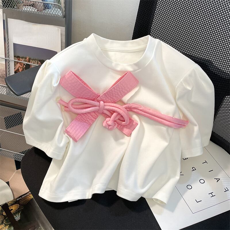 Komiyama 夏コントラストカラーパッチワーク 3D リボン Y2k トップスラウンドネックパフスリーブ Tシャツスイートフレッシュ Tシャツ Ropa 大人ガーリー スウィート キュート カジュアル サマー 夏物 Oネック | eight