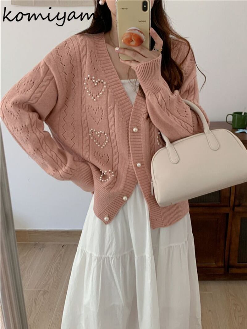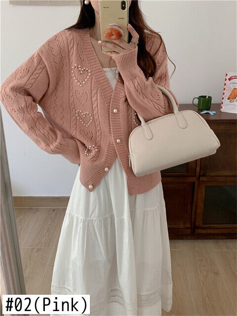 Komiyama スイートハートビーズカーディガン V ネック長袖セーター秋レディースパールボタンニットトップス ロング 大人ガーリー スウィート キュート カジュアル オータム 秋物 Vネック 真珠 | eight