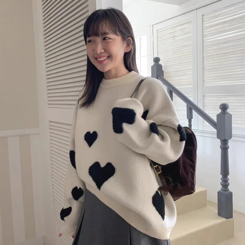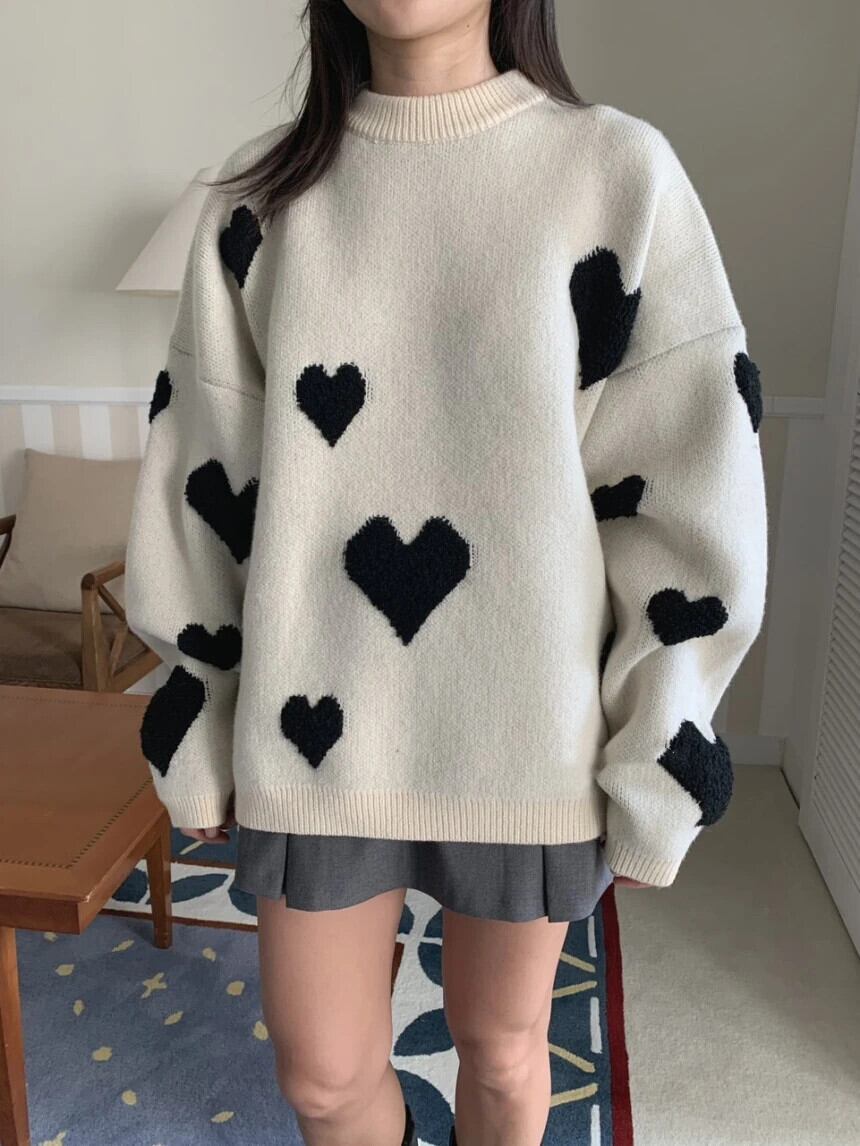ハートジャカードセーター秋冬暖かいレディーススイートロパフルスリーブプルオーバートップス O ネックニット 大人ガーリー スウィート キュート カジュアル オータム 秋物 ウィンター 冬物 Oネック | eight