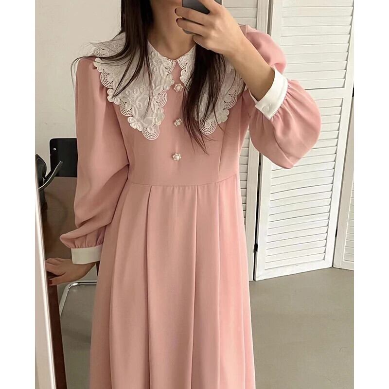 ウエストプリーツ Vestidos コントラストラペルネック Vestido 春ドレスパフスリーブ Ropa 甘いボタンドレス 大人ガーリー スウィート キュート カジュアル スプリング 春物 | eight