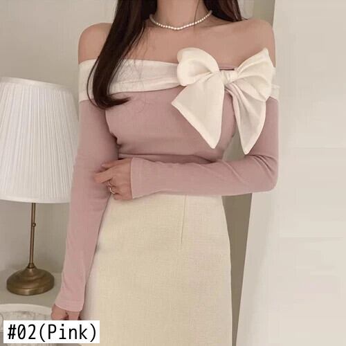 Feminino セクシースラッシュネックセーターパッチワークボウロパ長袖プルオーバー春レディース甘いニット ロング リボン 大人ガーリー スウィート キュート カジュアル スプリング 春物 | eight