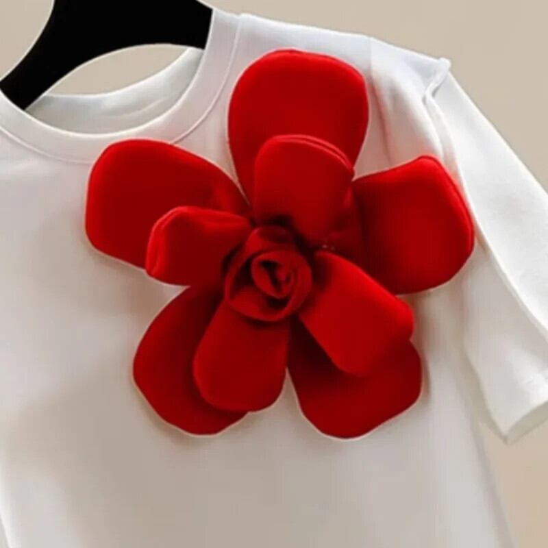 コントラスト 3D フラワー Ropa O ネック半袖トップス夏 Tシャツ甘い Camisetas 2024 ユニーク ショート ハーフスリーブ 大人ガーリー スウィート キュート カジュアル サマー 夏物 Oネック フラワーデザイン | eight