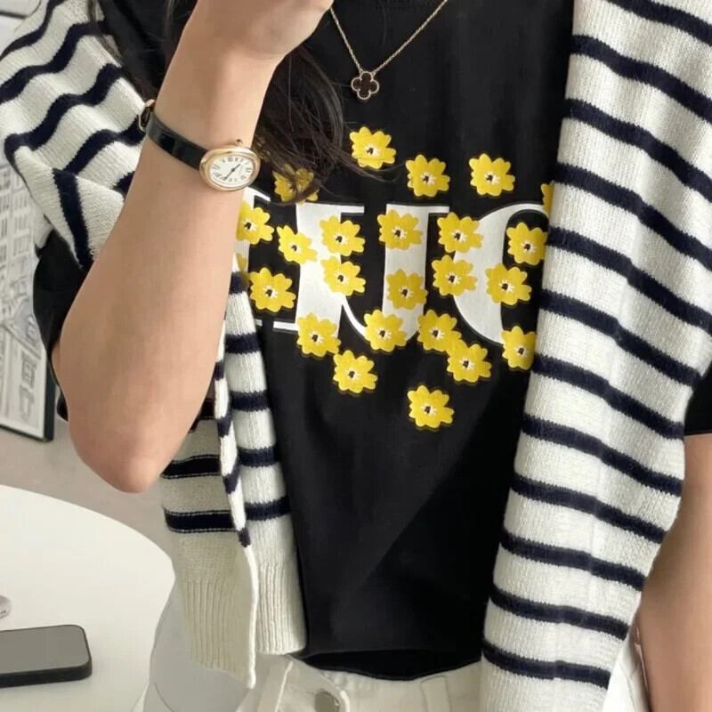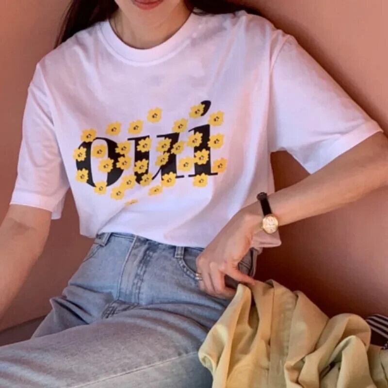 シックレターフラワープリント Ropa 半袖トップス O ネック Tシャツ甘い Camisetas 夏 2024 ショート ハーフスリーブ 大人ガーリー スウィート キュート カジュアル サマー 夏物 Oネック フラワーデザイン | eight