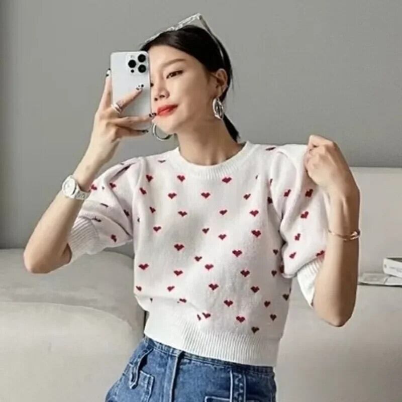 コントラストラブハート Ropa パフ半袖トップスラウンドネック Tシャツ 2024 夏 Camisetas 甘い ショート ハーフスリーブ 大人ガーリー スウィート キュート カジュアル サマー 夏物 Oネック | eight