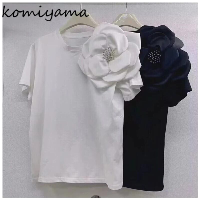 夏 2024 ビーズフラワー Ropa トップス半袖 Tシャツルーズ Camisetas ラウンドネック ショート ハーフスリーブ サマー 夏物 Oネック ソリッドカラー フラワーデザイン | eight