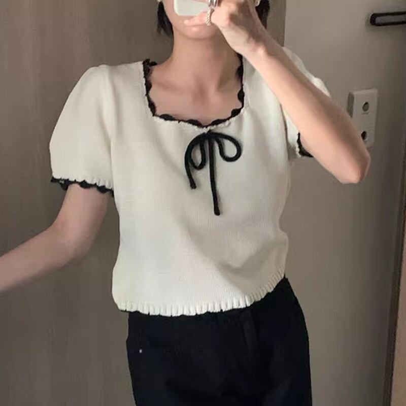 コントラストボウ Ropa パフ半袖トップススクエアカラー Tシャツ 2024 夏 Camisetas 甘い ショート リボン ハーフスリーブ 大人ガーリー スウィート キュート カジュアル サマー 夏物 スクウェア | eight