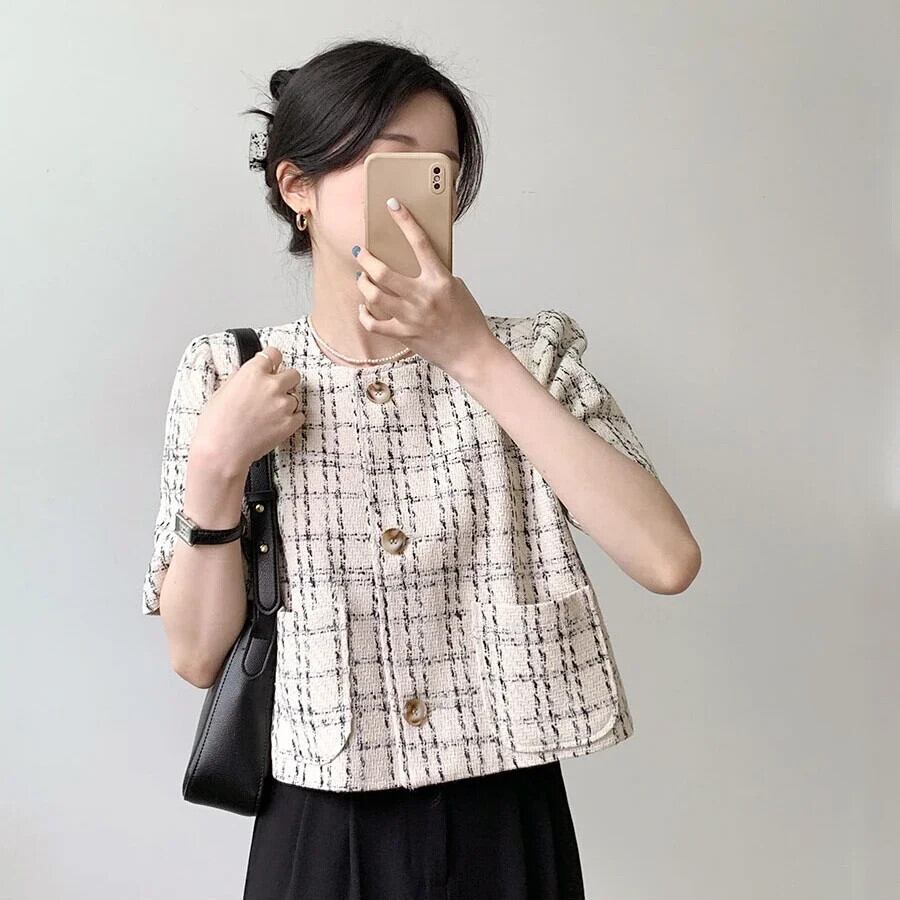コントラストチェック柄 Ropa ツイード Chaqueta es O ネック半袖ジャケット Samll フレグランスコート春夏 ショート ハーフスリーブ スプリング 春物 サマー 夏物 Oネック | eight