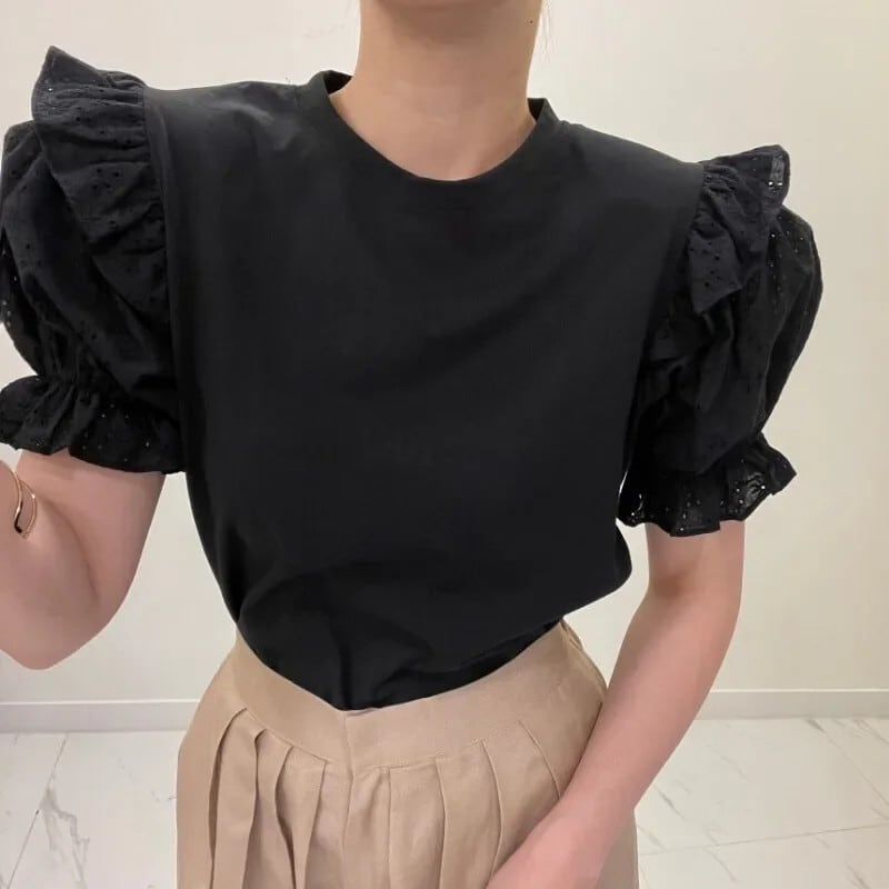 フック花 Ropa フリル刺繍トップス半袖 Tシャツラウンドネック Camisetas 夏 2024 甘い ショート ハーフスリーブ ラッフル 大人ガーリー スウィート キュート カジュアル サマー 夏物 花柄 Oネック | eight