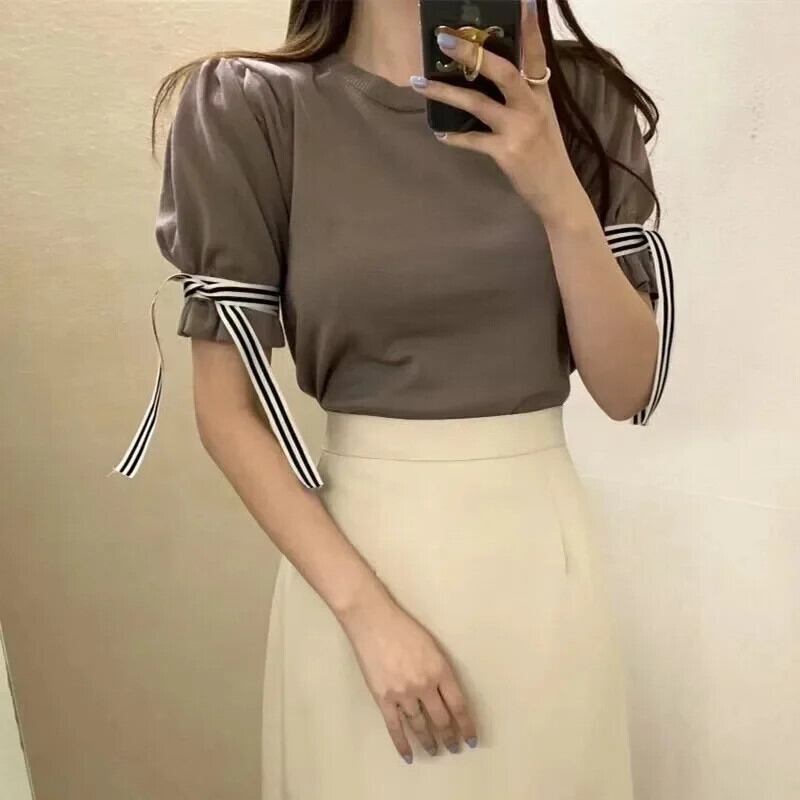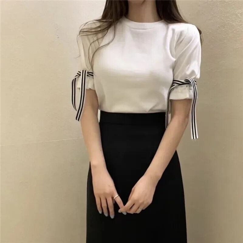 ヒットカラー包帯半袖 Ropa ラウンドネックトップスベーシック Tシャツ甘い Camisetas 夏 ショート ハーフスリーブ 大人ガーリー スウィート キュート カジュアル サマー 夏物 Oネック | eight