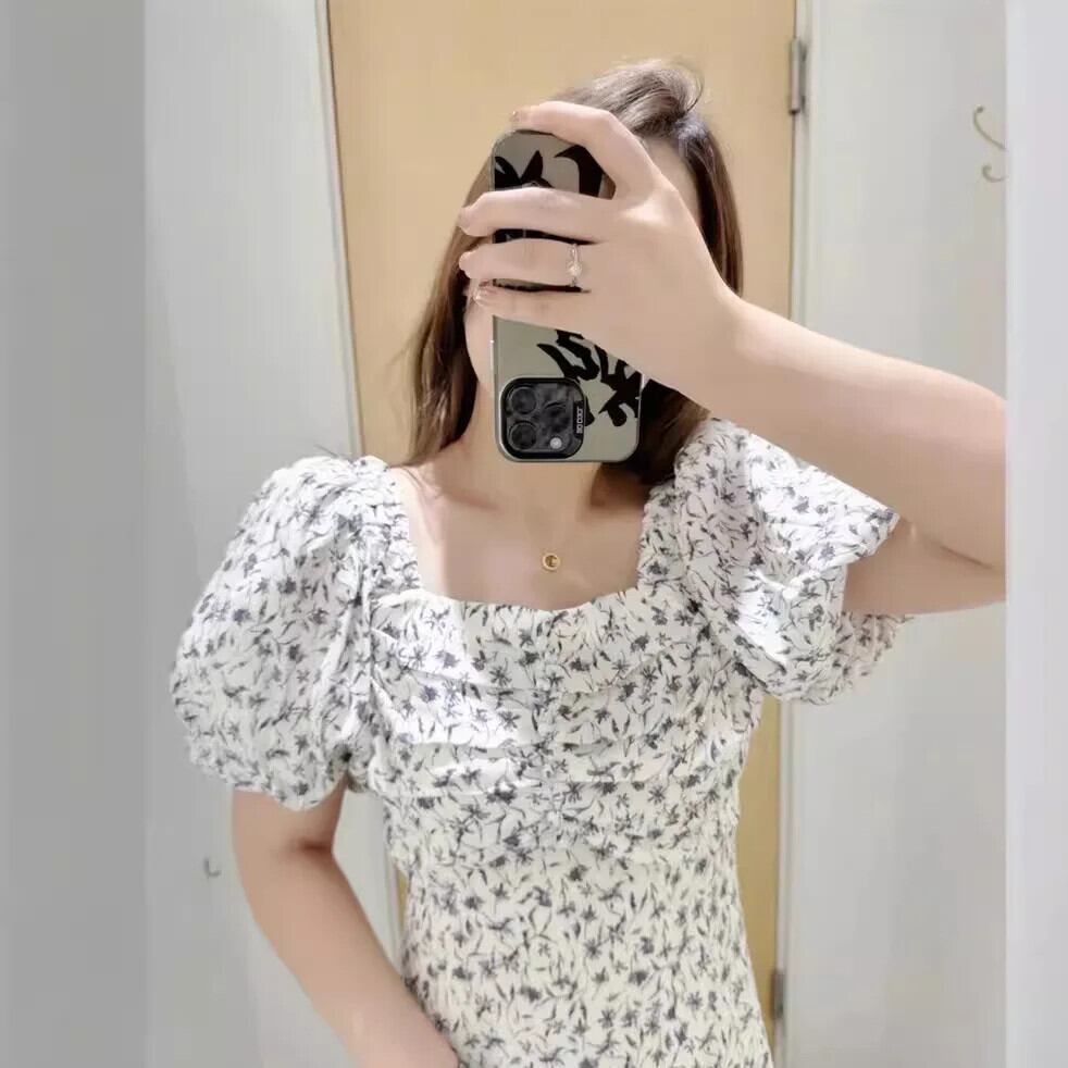 2024 春夏プリントドレススクエアカラー Vestidos ウエスト A ラインドレスパフ半袖 Vestido Ropa ショート ハーフスリーブ スプリング 春物 サマー 夏物 Aライン スクウェア | eight