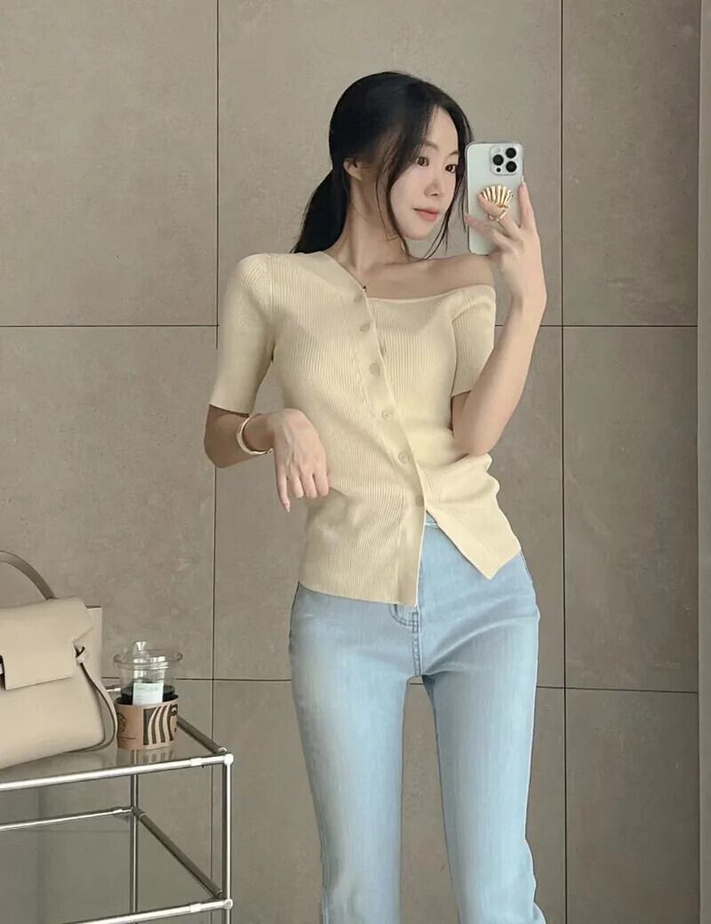 Unregelmäßige schulter freie Ropa Kurzarm Camisetas koreanische Frauen 2024 トップス feminino セクシー gestrickte T シャツ Sommerkleid ung Tシャツ | eight