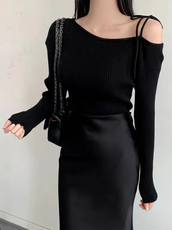 Unregelmäßiger Schräg kragen Ropa schulter frei Schnürung Roupas Herbst Frau 2024 トップス Langarm プルオーバー ische Sueteres | eight