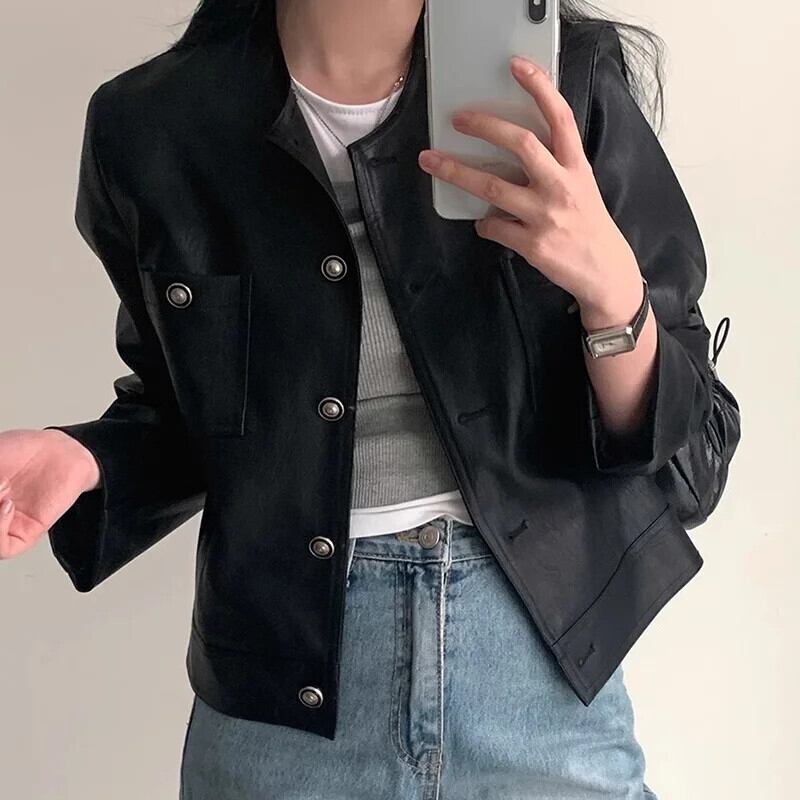 Einreihige Chaquetas O-Ausschnitt Langarm Jaqueta Pu Leder Ropa loss lässige Oberbekleidung koreanischen Casaco | eight