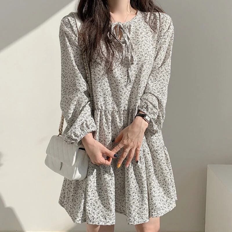 O-Ausschnitt Schnür schleife Vestidos gebrochene Blume Frauen kleider Langarm Kleid hohe Taille Mini Vestido 2024 A-Linie Roben ミニ | eight