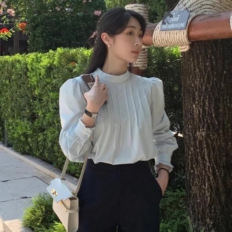 ische schicke plattierte Hemden & Blusen stehen Kragen Langarm koreanische Nische Ropa Frau 2024 Herbst neue Blusa | eight